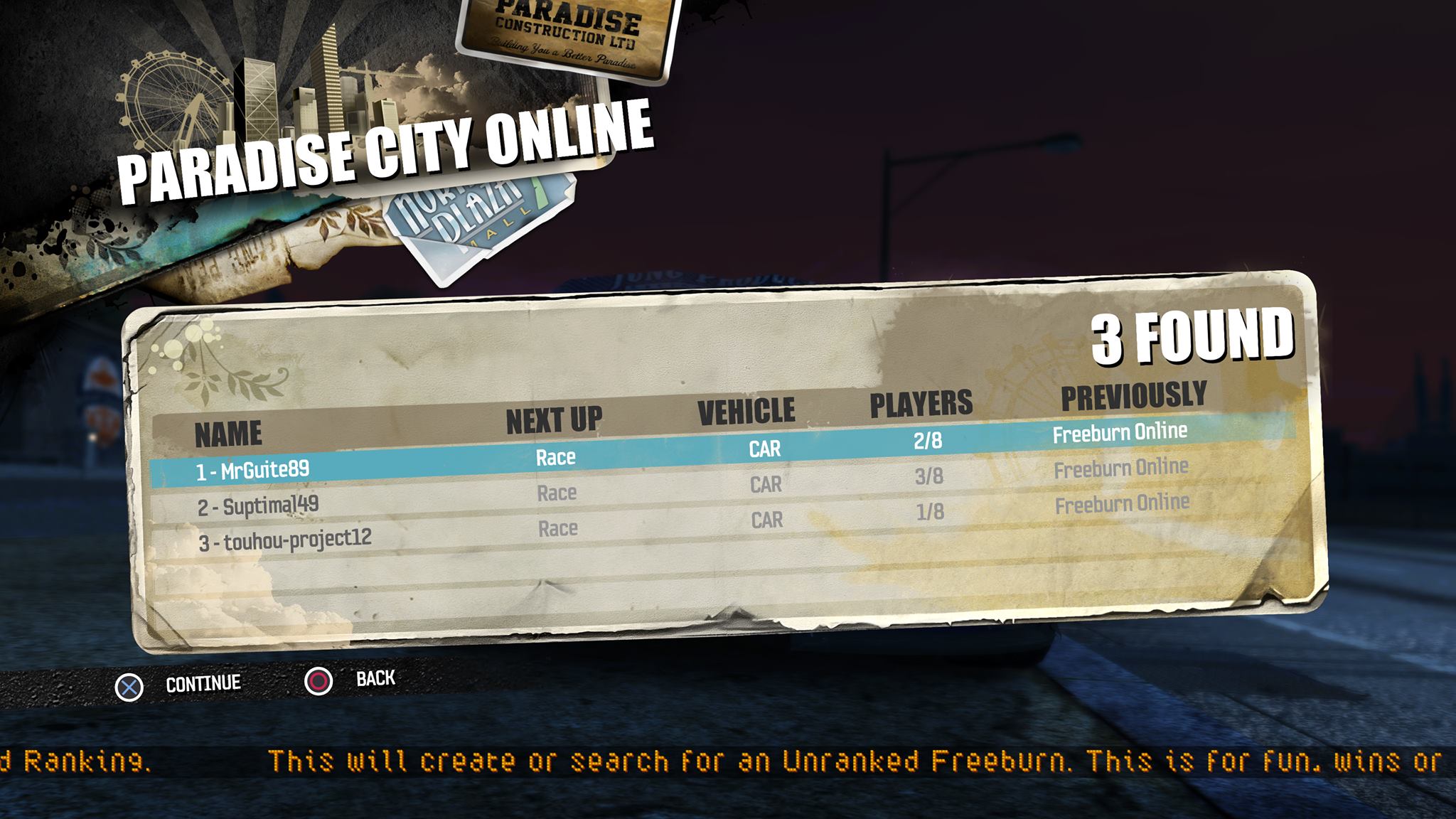 Since more often than not I actually got to play Paradise, I should probably say something about the game itself. You’re thrust into an open world environment where events are activated at any street intersection, cars are earned by tracking down and crashing into them, and every single car inexplicably lacks a driver.