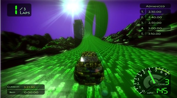 Even worse, you haven’t improved the game, you’ve made it worse. The XNA Racer sample game is actually a pretty colorful, beautiful looking game, and both Blueprint Racer 4D and 2060 Cyber Racer turn it into a graphically noisy trainwreck.