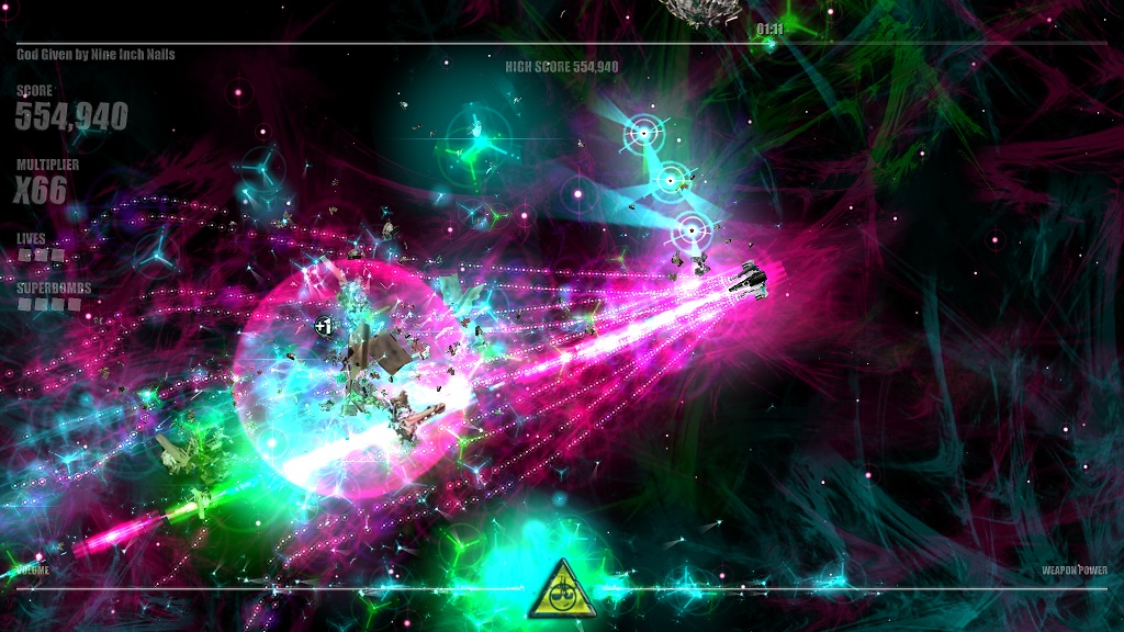 The actual gameplay is good – solid at the very least – but mostly made thrilling by the music integration. The variety of enemies can get boring a bit too quickly because there isn’t a ton of interesting behavior. There’s nothing like those weaselly green enemies in Geometry Wars – everything more or less flies in a set pattern and tries to crash into you or shoot you.