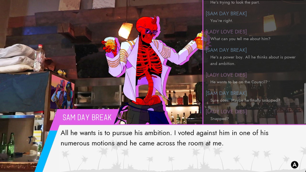 All that aesthetic charm wouldn’t mean much if the story fell flat, but that’s not a worry here. Paradise Killer’s central mystery is a wild, meandering conspiracy that had me guessing and chewing on my own theories until every last clue was obtained. I played extremely thoroughly, but you can take your evidence and begin the final trial at any time.
