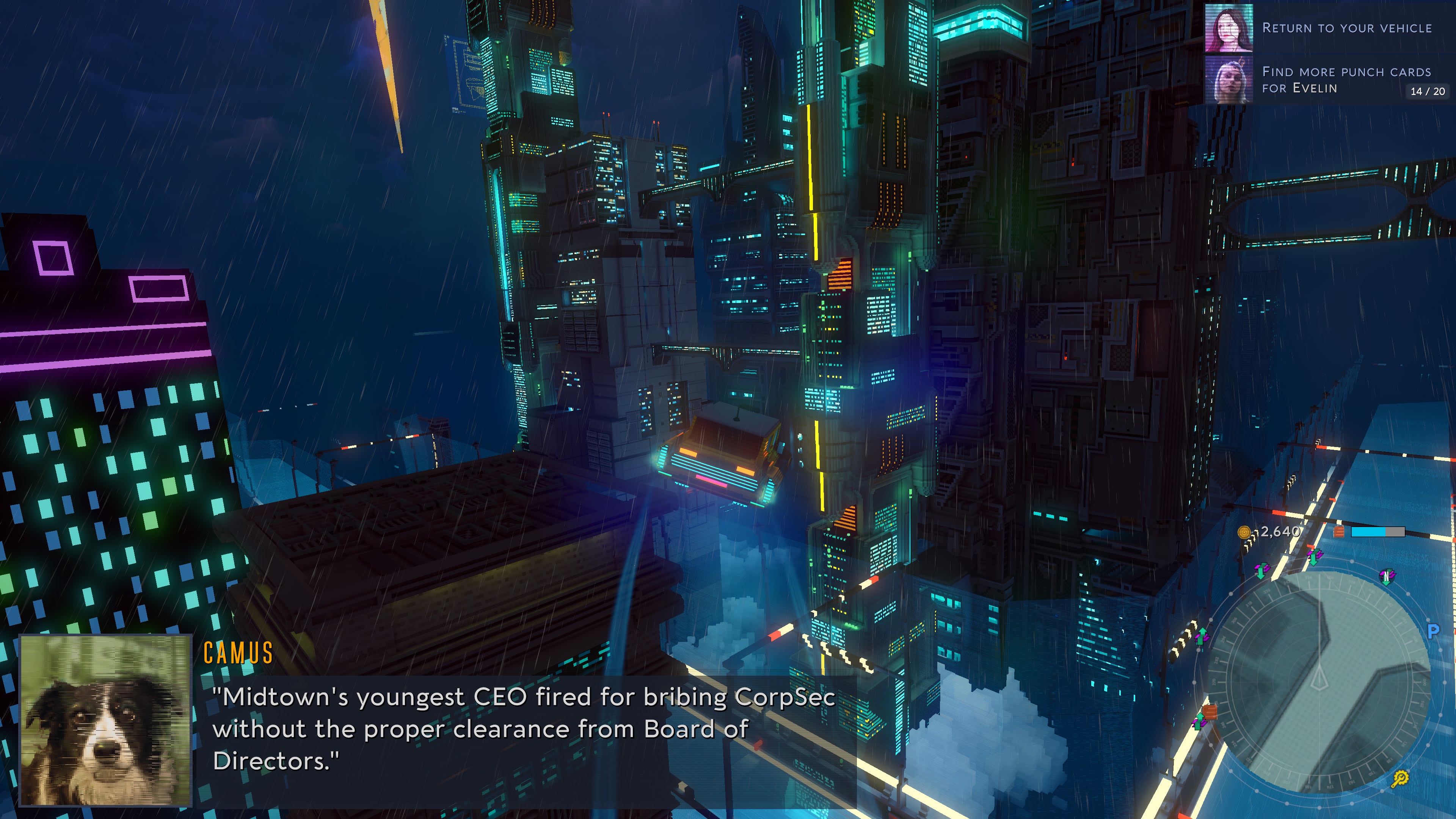 As you make deliveries around the city, the story and cast of characters expands, and a main thread begins to unfold. It’s impressive just how much story Cloudpunk has, especially since it’s fully voice acted. That said, the voice acting is really hit-and-miss, with main characters and side characters alike that took me completely out of the vibe of the world. A lot of the characters and writing felt overly precious or silly to me, and despite a dark, serious plot, I was never entirely sure what kind of tone the game was going for.