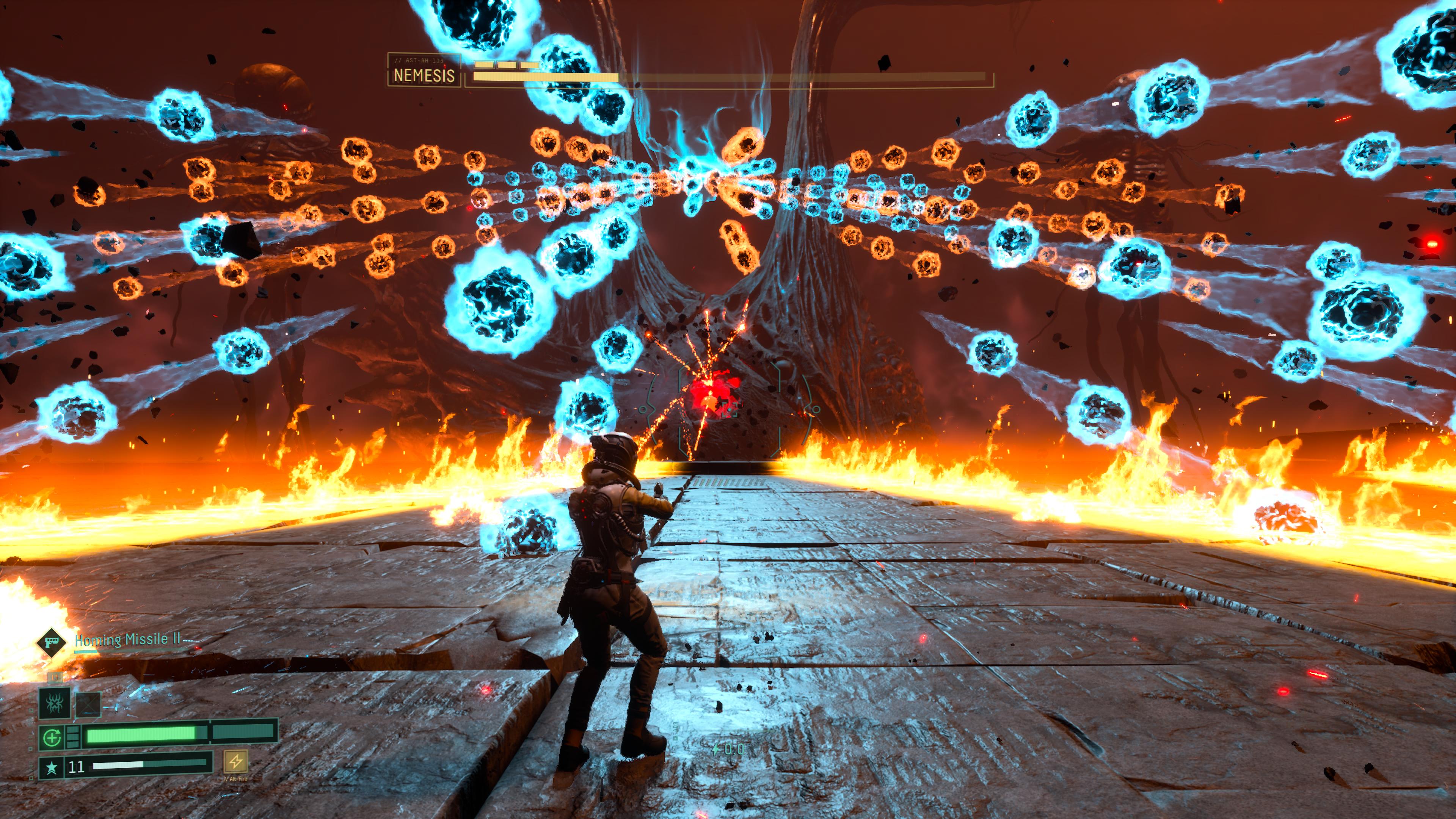 Returnal plays like a slick, fast-paced third person shooter—think Mass Effect Andromeda if it felt as polished as Titanfall 2—but it also brings arcade-y, bullet-hell shooter concepts into a 3D space. Enemies launch slow-moving, beautiful volleys of green and blue orbs among aggressive red and orange homing missiles, while your progress relies on a massive collection of power-ups and weaponry.