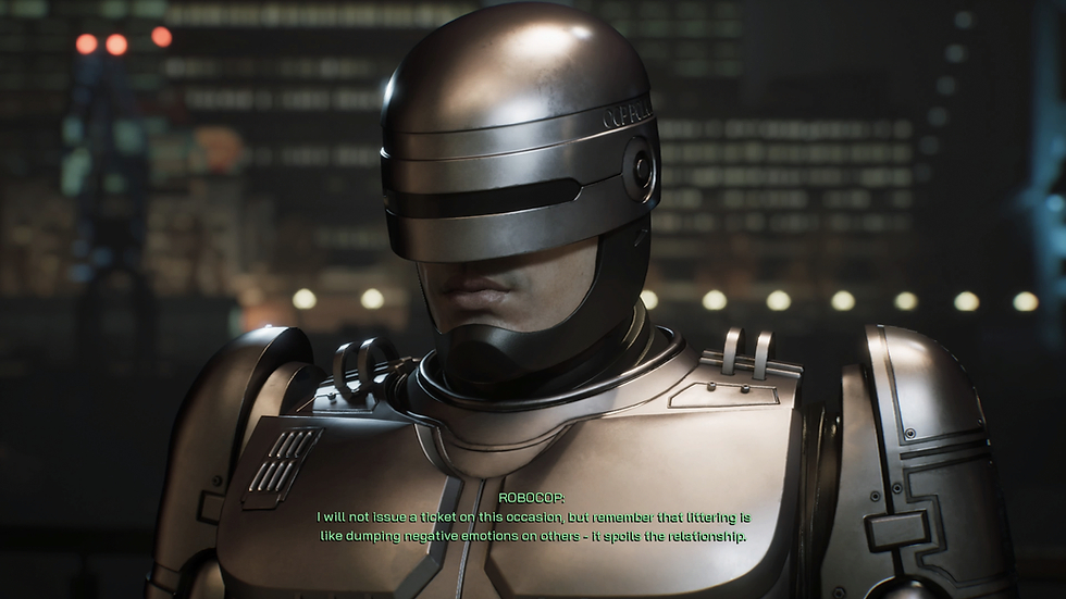 There’s still a good bit of satire and cynicism here, but considering a series of mini-open world zones and sidequests can make the game somewhere between 10-20 hours long, I think the devs made the right choice in lightening up the tone a little. Each quest gives you the opportunity to uphold the law or gain the public’s trust. In my playthrough that meant Robocop made friends, went to therapy, danced for kids, and saved a cat from a burning building.