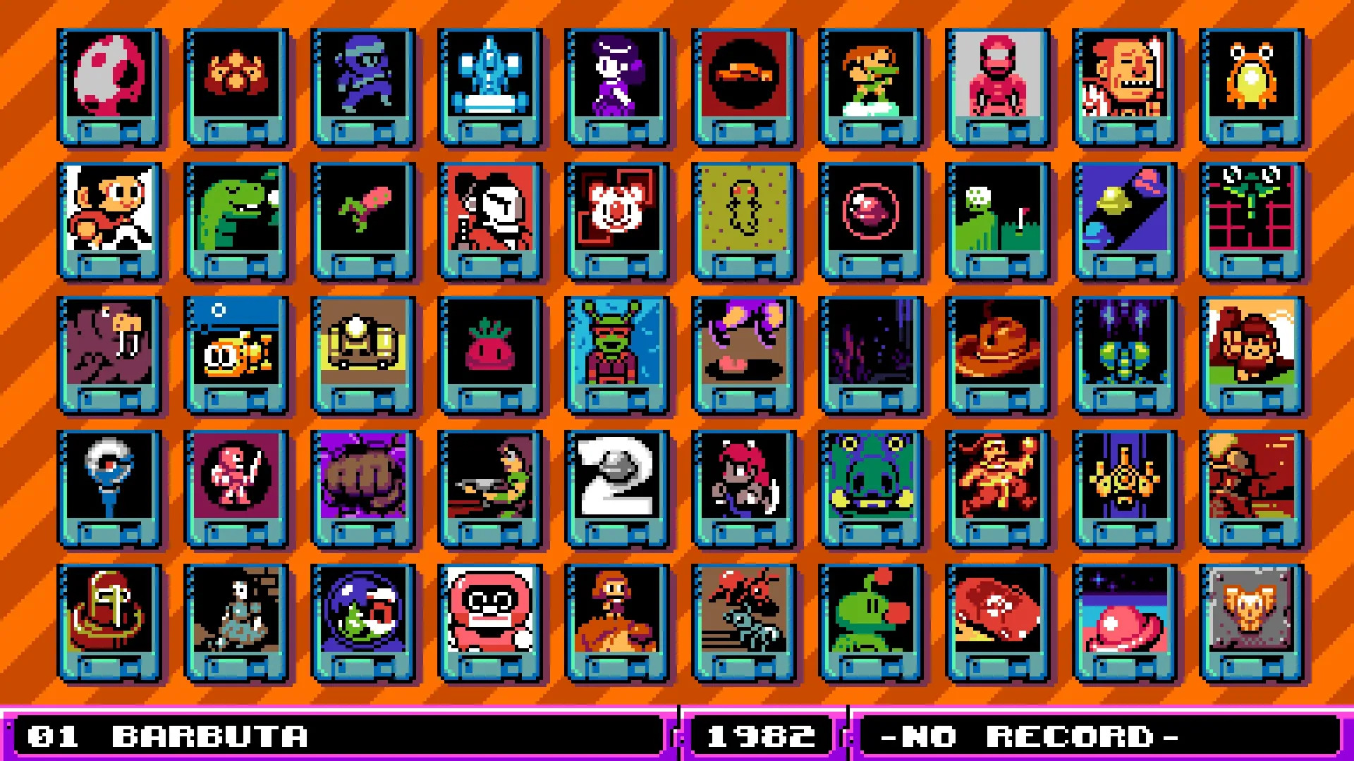 The premise of the game imagines a development studio in the 80s that made a bunch of different games over the years. UFO 50 itself is meant to be like a modern day museum-esque collection of all of these games with little blurbs about each game’s development and the fictional teams behind them. It also displays the games in sequential order, so the earlier games are more graphically simplistic and feature more arcade-like gameplay. Eventually you start coming across sequel games and mascot characters that show up again and again.